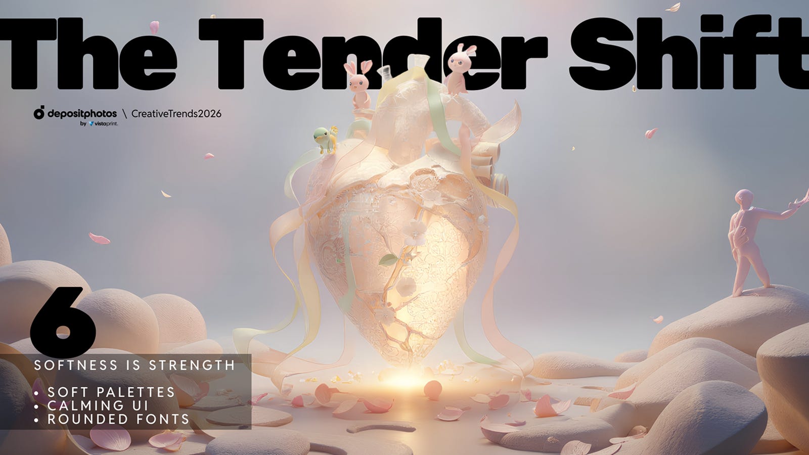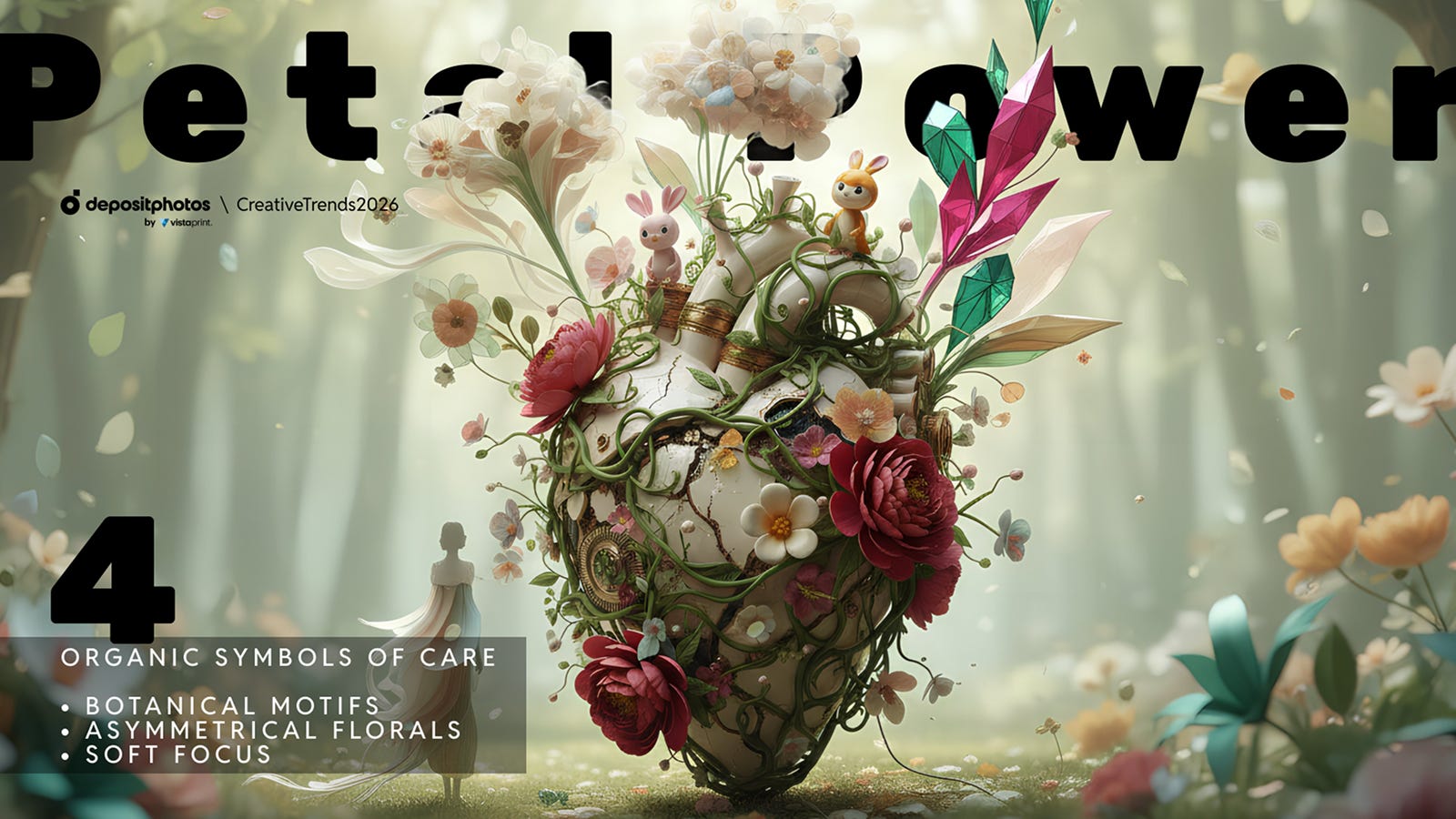 Окремий блок креативних трендів 2026 стосується м’яких естетик, спрямованих на емоційну підтримку. «Естетика розквіту» описує повернення квітів як головного візуального символу: запити на flowers, organic pattern, petals background на Depositphotos зросли вдвічі. Квіти стають метафорою відновлення, циклів, турботи й повільного зростання.