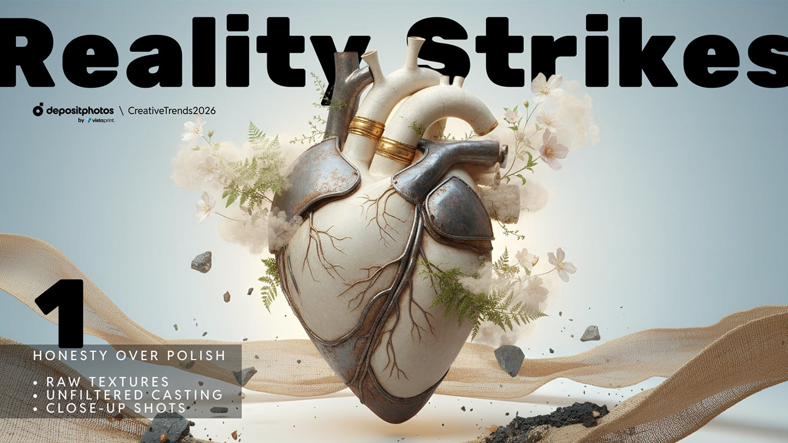 2026 року креативники сповільняться й зосередяться на змістовних змінах. Щирі емоції та усвідомлені меседжі мають витіснити перевантаження та гучні заяви ні про що. На цьому акцентує команда Depositphotos у звіті «Креативні тренди 2026» після аналізу пошуків та завантажень 40 млн користувачів із бібліотеки з понад 320 млн файлів, опитування експертів та створення контекстуальних добірок. Дивимося, які орієнтири вони визначили для креативників.