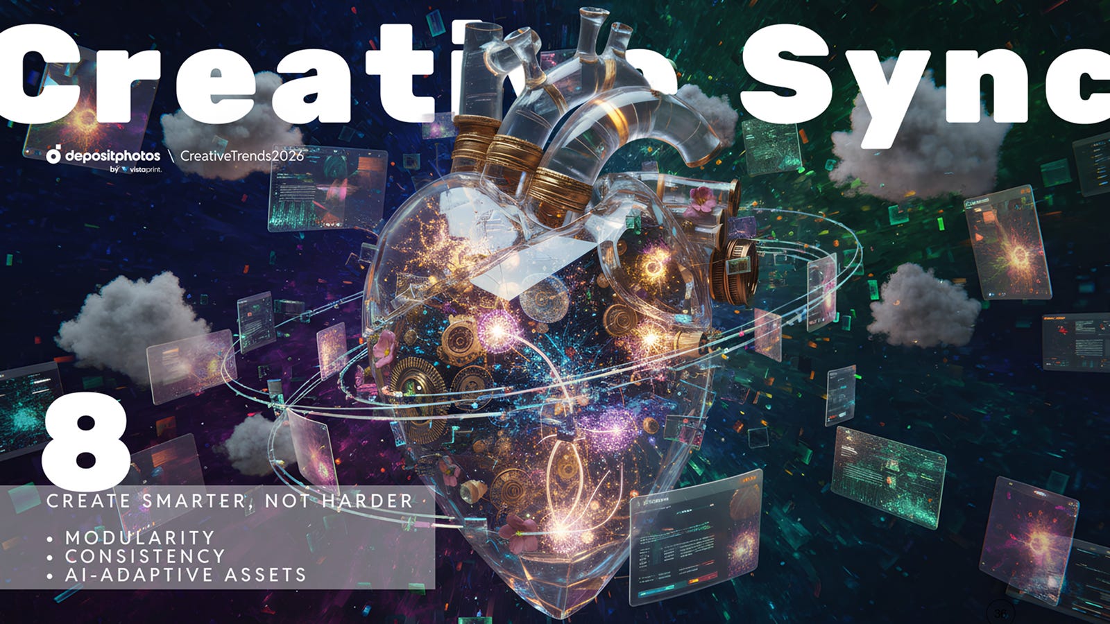 Завершальний тренд — «Креативна синхронізація» — описує трансформацію креативних процесів. 2026 року головне питання для команд — не лише «які інструменти ми використовуємо», а «як вони об’єднані». Під тиском очікувань «швидко й без збоїв» креативні відділи будують воркфлоу, де бренд-кіти, стокові бібліотеки, ШІ-інструменти, дизайн-платформи й таск-менеджмент працюють як єдина екосистема.