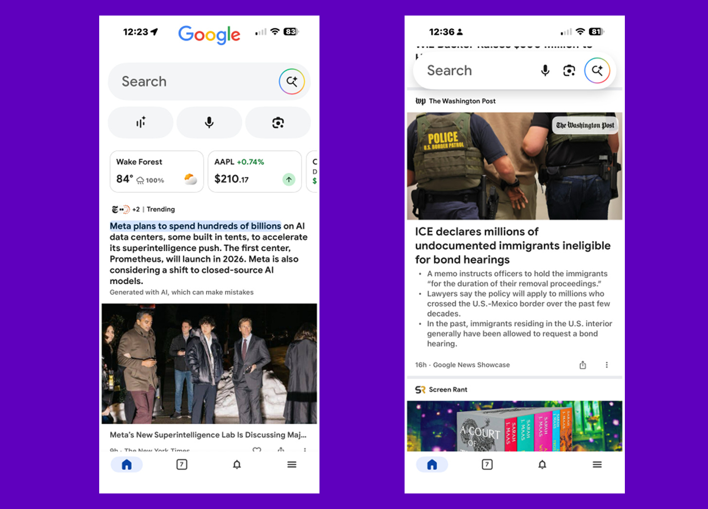 У мобільному застосунку Google (саме окремій програмі, а не домашній сторінці у Chrome) цього тижня помітили ШІ-нововведення. Замість звичних нам картинок і заголовків від кожного сайту там тепер показують підсумок, згенерований ШІ, і логотипи видавців, звідки розумник набрався інфи для цього.