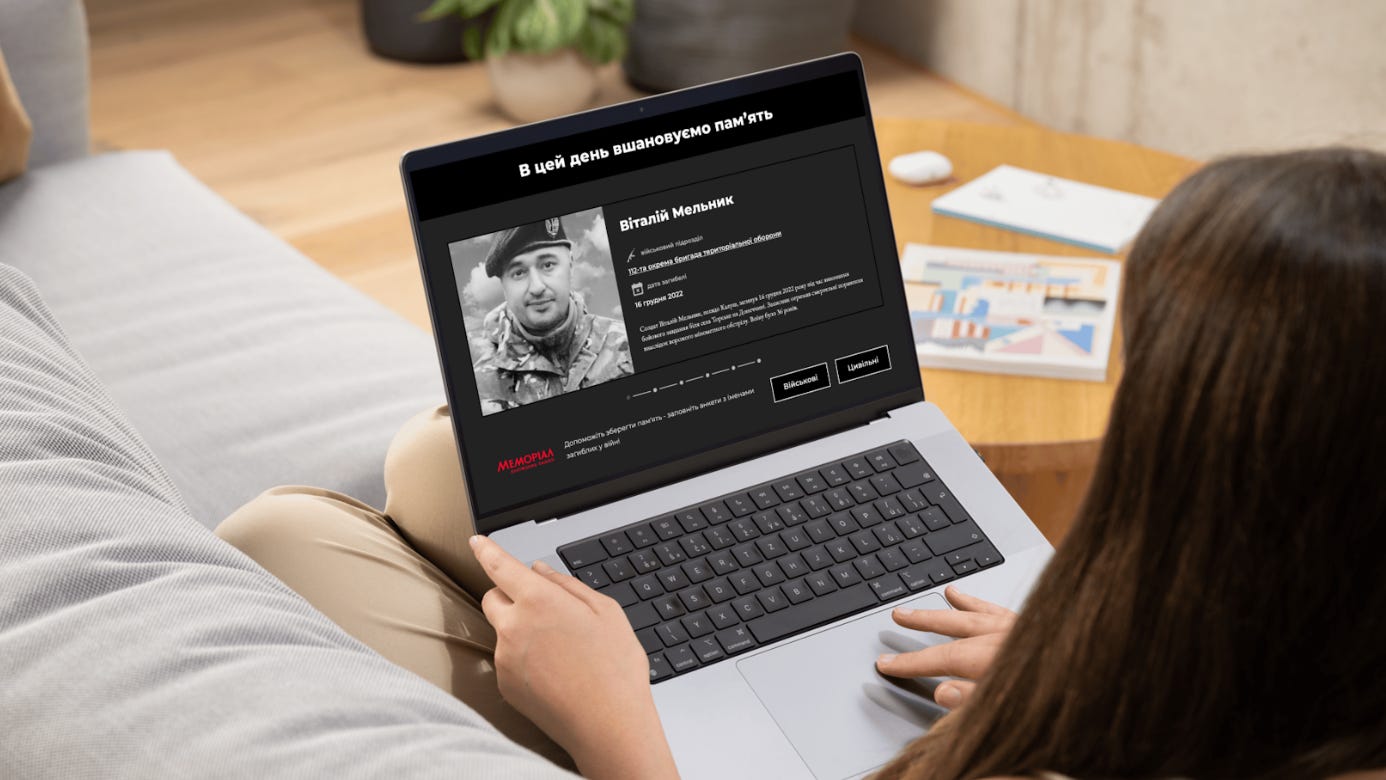 Суть і формат: спеціальний блок «В цей день вшановуємо памʼять», який можна інтегрувати на сайти медіа, автоматично підтягує дані з бази «Меморіалу» і щодня показує світлини та короткі життєписи військових і цивільних, які загинули саме в цей день у різні роки російсько-української війни.