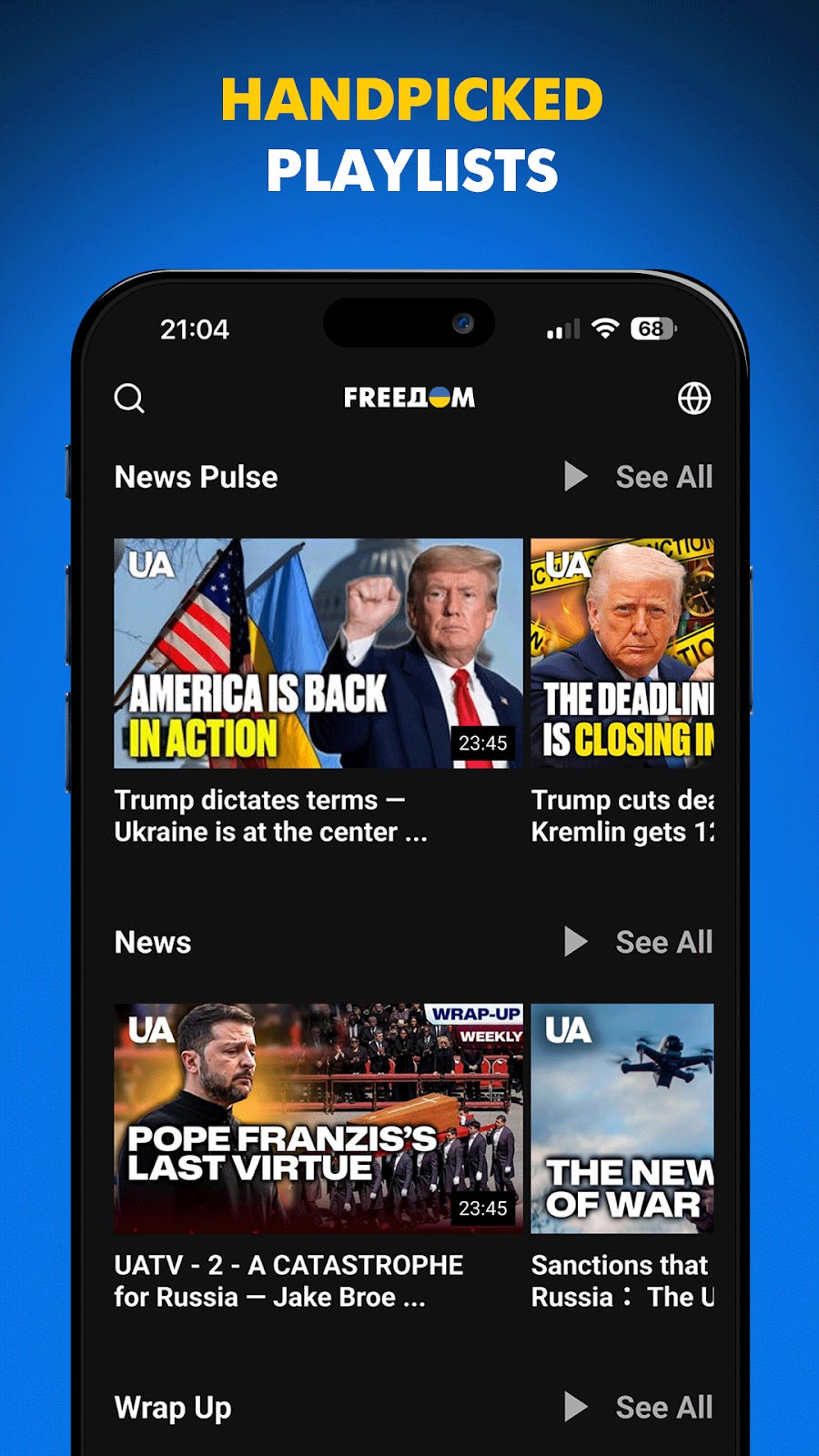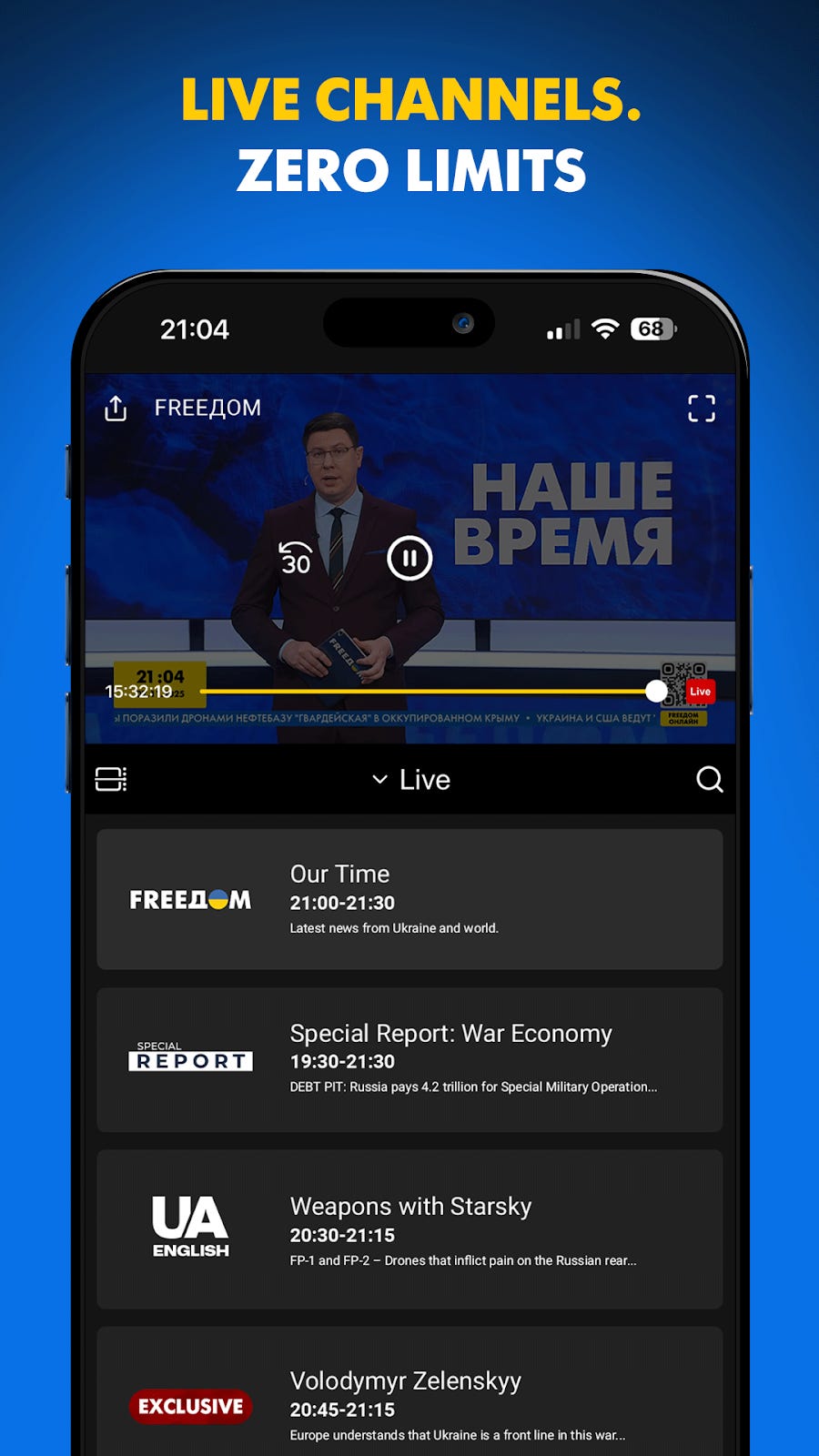 Суть і формат: це безплатний мобільний застосунок, який дає доступ до прямого ефіру каналу та бібліотеки контенту. У ньому вже доступні програми «Спеціальний репортаж», «В ізоляції», «Новини вільних народів», «Трибунал», «Федя, дичь», «Гібридні спецоперації», «Стратегія свободи», а також добірка документальних фільмів та інші проєкти.